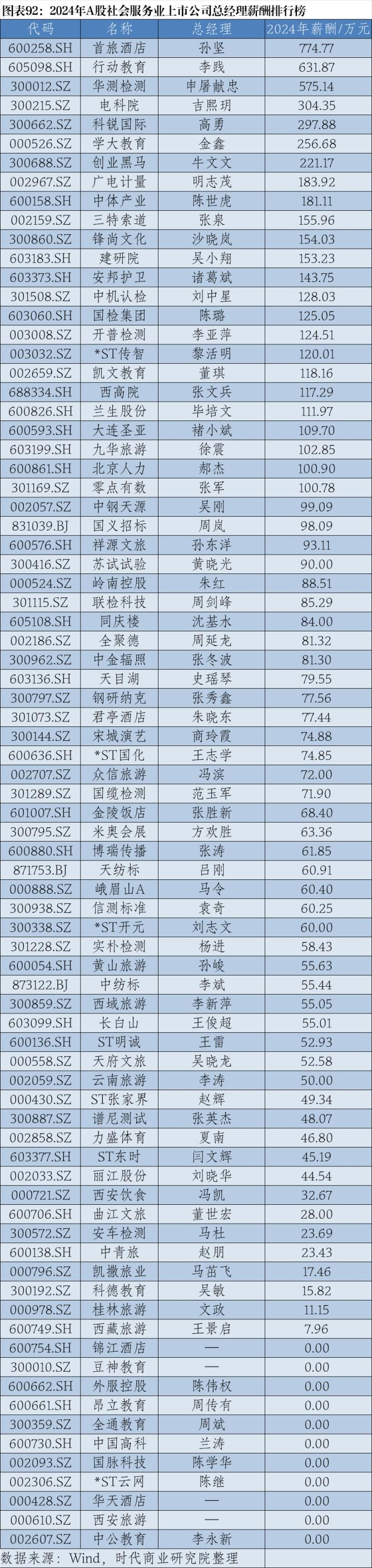 2024年,A股社会服务业总经理的薪酬平均值为115.98万元。其中,薪酬最高的是首旅酒店(600258.SH)孙坚,为774.77万元;薪酬最低的是西藏旅游(600749.SH)王景启,为7.96万元。