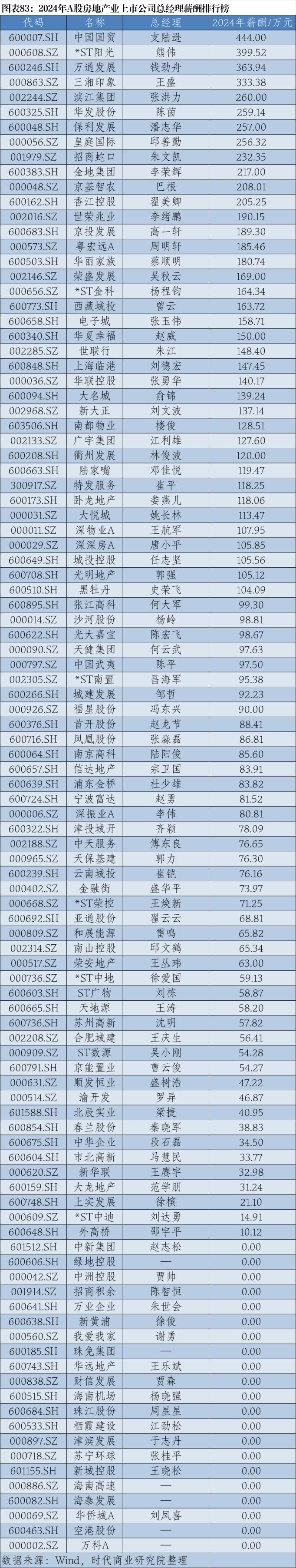 2024年,A股房地产业总经理的薪酬平均值为122.23万元。其中,薪酬最高的是中国国贸(600007.SH)支陆逊,为444.00万元;薪酬最低的是外高桥(600648.SH)邵宇平,为10.12万元。