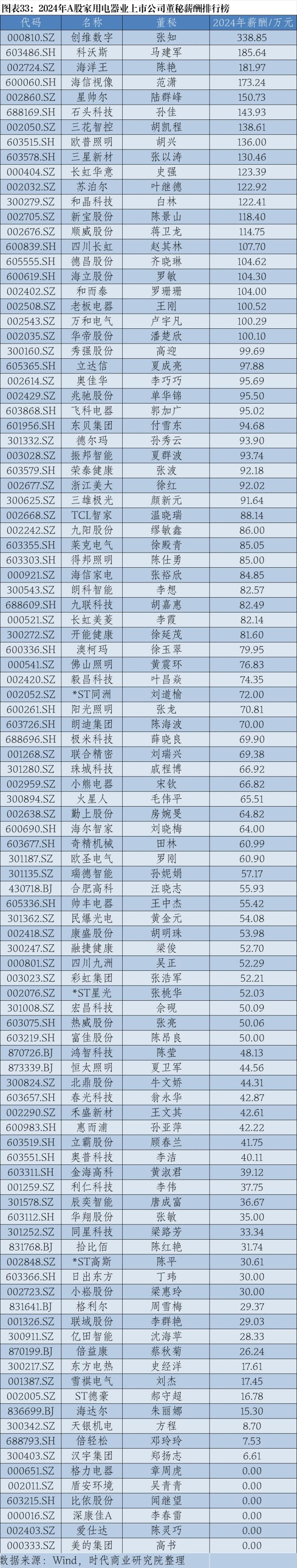 Wind数据显示,2024年,A股家用电器业董事长的薪酬平均值为169.74万元。其中,薪酬最高的是格力电器(000651.SZ)董明珠,为1437.20万元;薪酬最低的是创维数字(000810.SZ)施驰,为12.00万元。