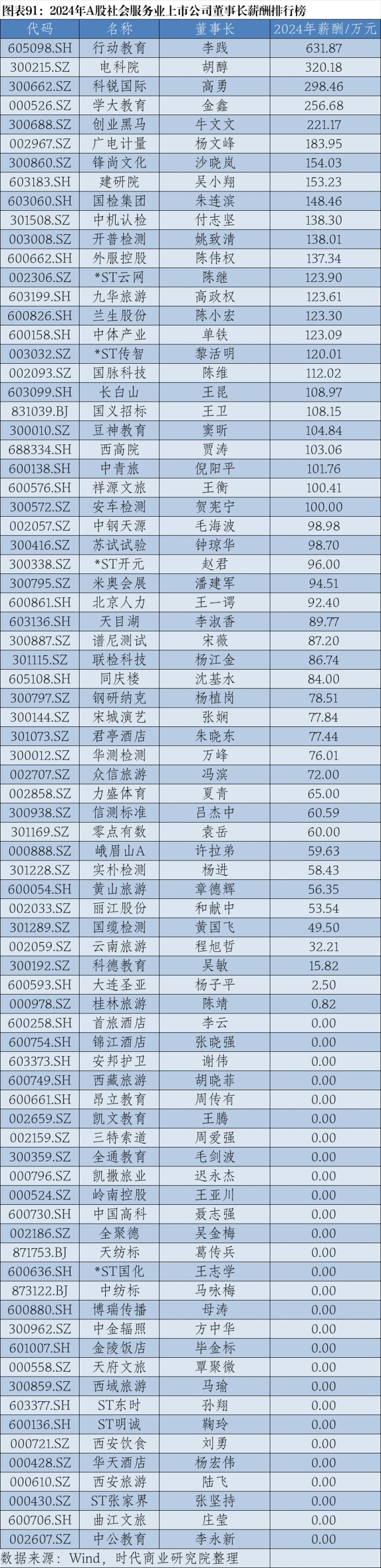 Wind数据显示,2024年,A股社会服务业董事长的薪酬平均值为116.85万元。其中,薪酬最高的是行动教育(605098.SH)李践,为631.87万元;薪酬最低的是桂林旅游(000978.SZ)陈靖,为0.82万元。