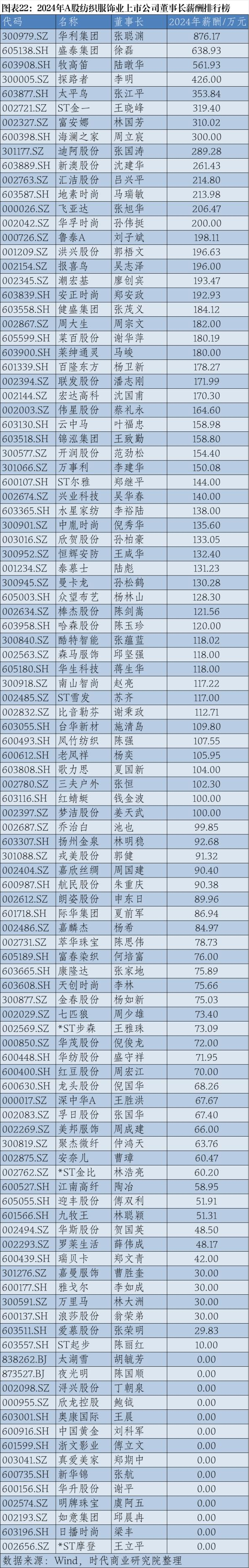 Wind数据显示,2024年,A股纺织服饰业董事长的薪酬平均值为146.20万元。其中,薪酬最高的是华利集团(300979.SZ)张聪渊,为876.17万元;薪酬最低的是ST起步(603557.SH)陈丽红,为10.00万元。