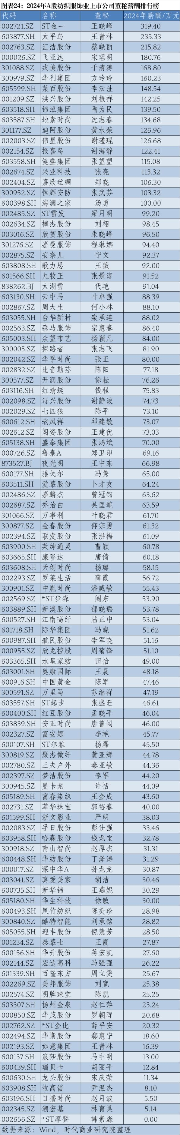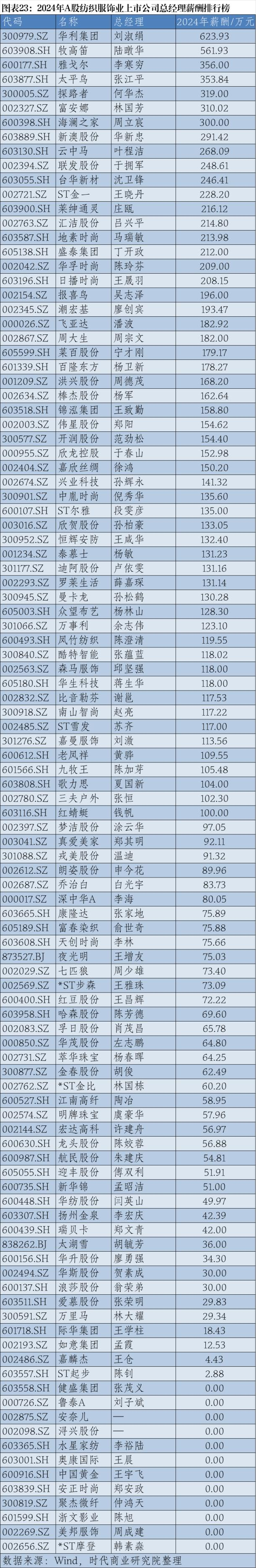2024年,A股纺织服饰业总经理的薪酬平均值为135.12万元。其中,薪酬最高的是华利集团刘淑绢,为623.93万元;薪酬最低的是ST起步陈钊,为2.88万元。