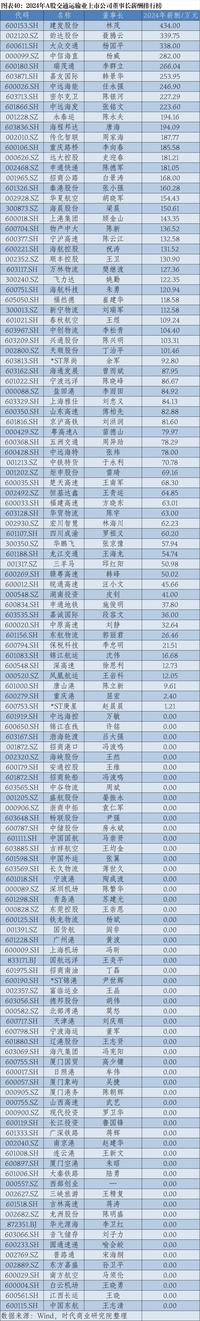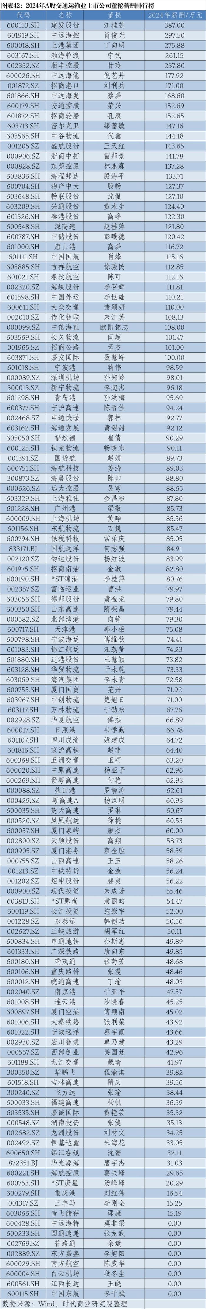 2024年,A股交通运输业总经理的薪酬平均值为127.07万元。其中,薪酬最高的是申通快递(002468.SZ)王文彬,为634.63万元;薪酬最低的是凤凰航运(000520.SZ)王岩科,为12.05万元。
