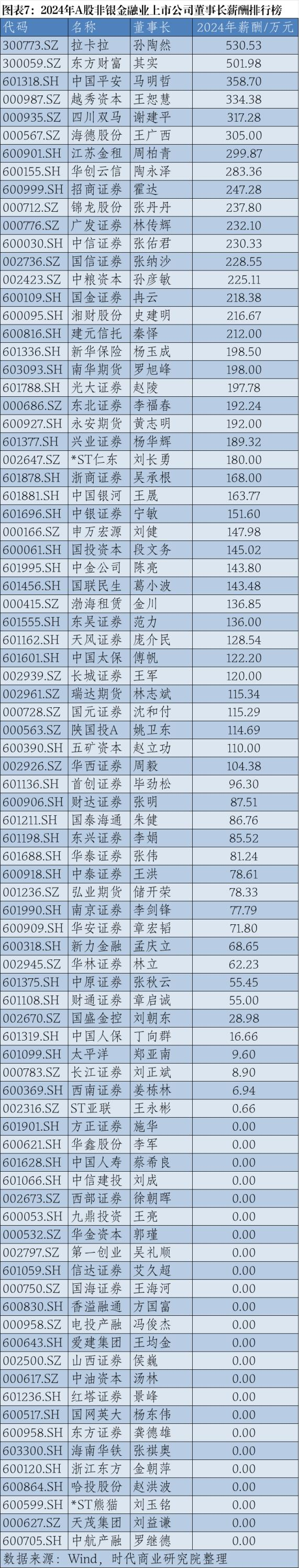 Wind数据显示,2024年,A股非银金融业董事长的薪酬平均值为160.85万元。其中,薪酬最高的是拉卡拉(300773.SZ)孙陶然,为530.53万元;薪酬最低的是ST亚联王永彬,为0.66万元。