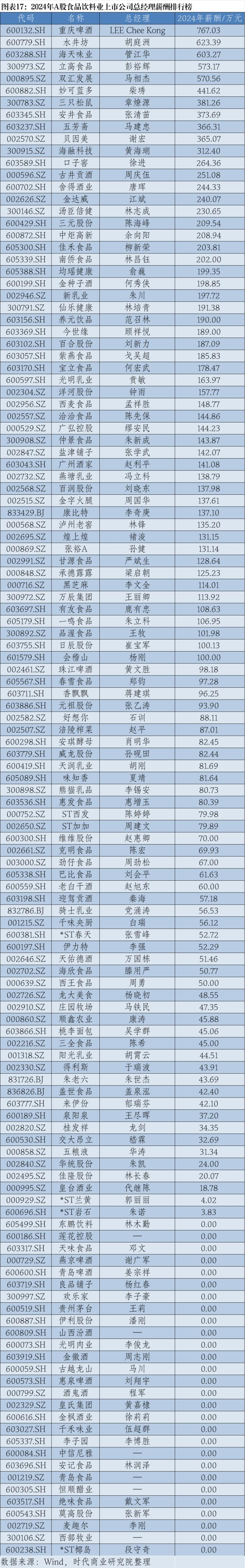 2024年,A股食品饮料业总经理的薪酬平均值为150.56万元。其中,薪酬最高的是重庆啤酒(600132.SH)LEE Chee Kong,为767.03万元;薪酬最低的是*ST岩石(600696.SH)朱诺,为3.83万元。