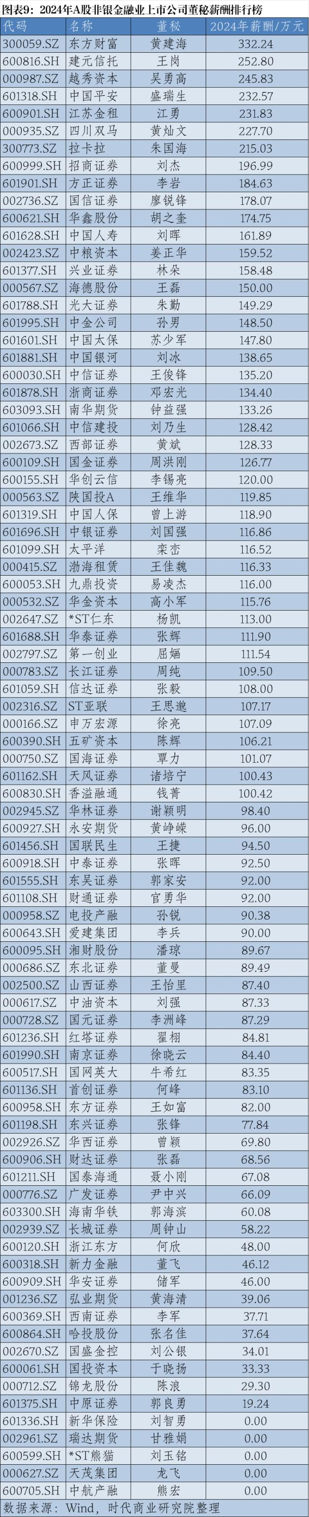 2024年,A股非银金融业董秘的薪酬平均值为114.33万元。其中,薪酬最高的是东方财富(300059.SZ)黄建海,为332.24万元;薪酬最低的是中原证券(601375.SH)郭良勇,为19.24万元。