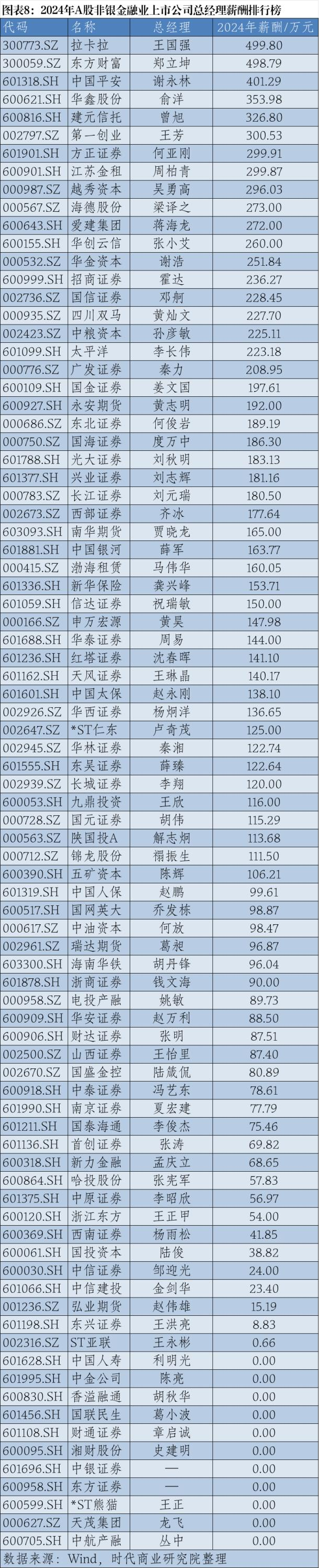 2024年,A股非银金融业总经理的薪酬平均值为158.50万元。其中,薪酬最高的是拉卡拉王国强,为499.80万元;薪酬最低的是ST亚联王永彬,为0.66万元。