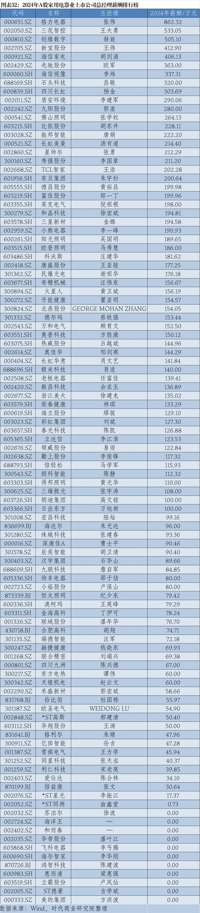 2024年,A股家用电器业总经理的薪酬平均值为156.14万元。其中,薪酬最高的是格力电器张伟,为862.32万元;薪酬最低的是*ST同洲(002052.SZ)由鑫堂,为0.73万元。