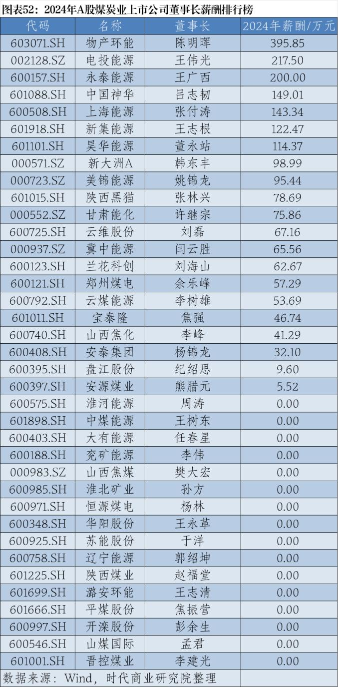 Wind数据显示,2024年,A股煤炭业董事长的薪酬平均值为101.56万元。其中,薪酬最高的是物产环能(603071.SH)陈明晖,为395.85万元;薪酬最低的是安源煤业(600397.SH)熊腊元,为5.52万元。