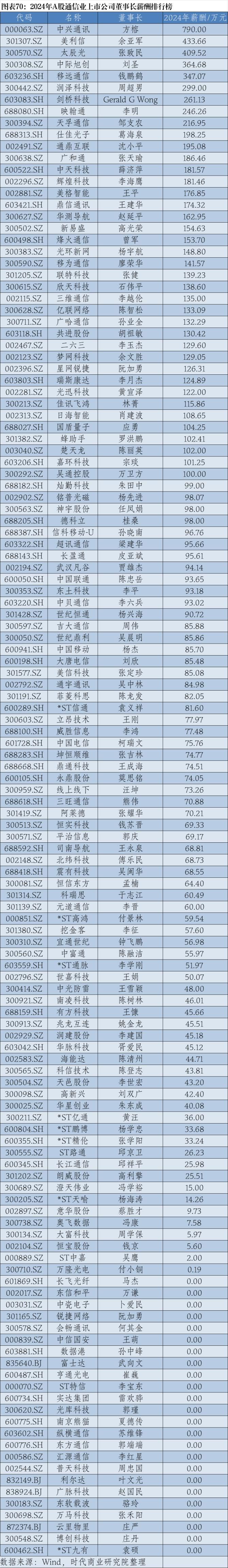 Wind数据显示,2024年,A股通信业董事长的薪酬平均值为109.18万元。其中,薪酬最高的是中兴通讯(000063.SZ)方榕,为790.00万元;薪酬最低的是万隆光电(300710.SZ)付小铜,为0.19万元。