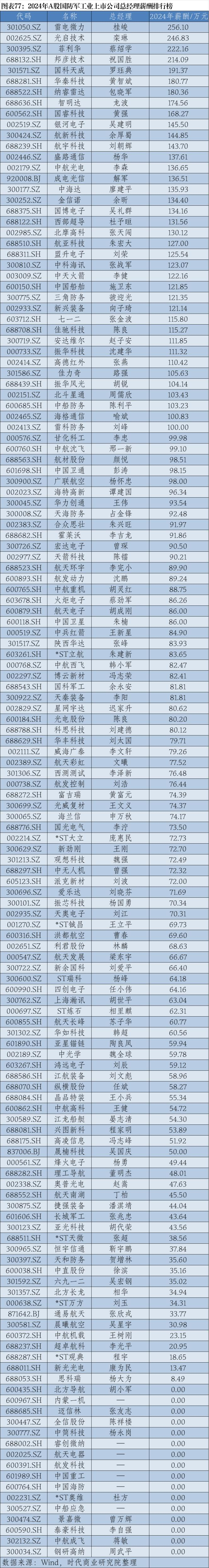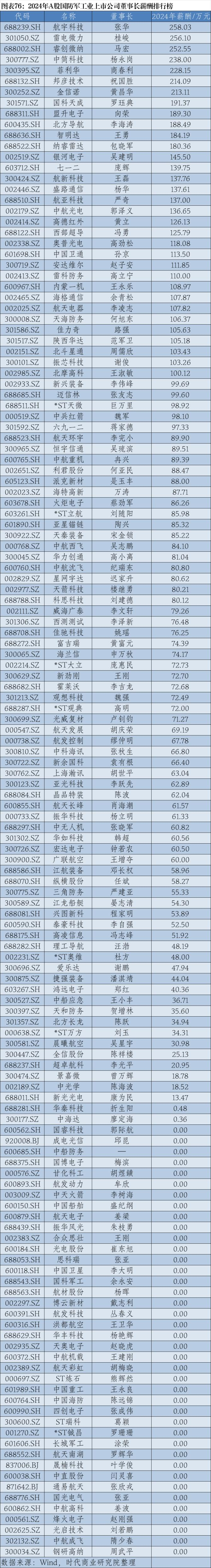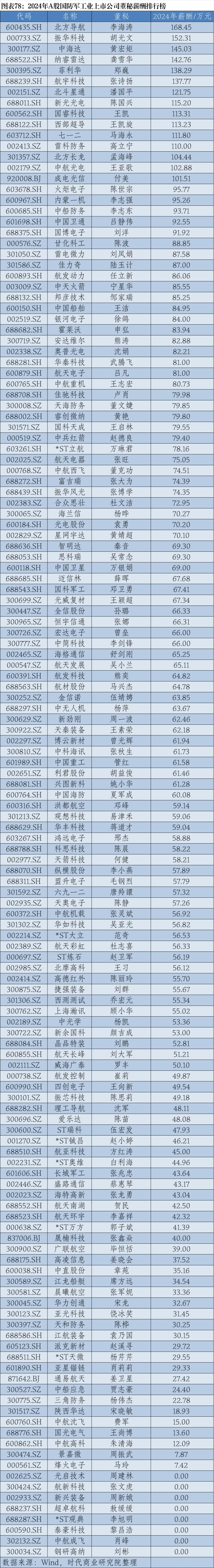 Wind数据显示,2024年,A股国防军工业董事长的薪酬平均值为92.74万元。其中,薪酬最高的是航宇科技(688239.SH)张华,为258.03万元;薪酬最低的是中海达(300177.SZ)廖定海,为0.36万元。