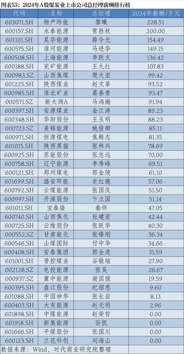 2024年,A股煤炭业总经理的薪酬平均值为74.69万元。其中,薪酬最高的是物产环能黎曦,为228.51万元;薪酬最低的是大有能源(600403.SH)赵光明,为2.96万元。