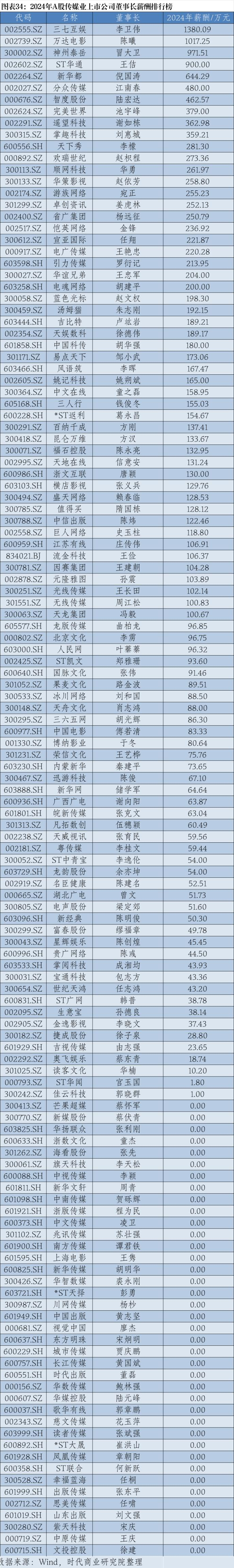 Wind数据显示,2024年,A股传媒业董事长的薪酬平均值为178.15万元。其中,薪酬最高的是三七互娱(002555.SZ)李卫伟,为1380.09万元;薪酬最低的是佳云科技(300242.SZ)郭晓群,为1.00万元。
