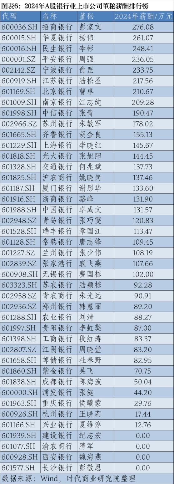 2024年,A股银行业董秘的薪酬平均值为130.59万元。其中,薪酬最高的是招商银行(600036.SH)彭家文,为276.08万元;薪酬最低的是兴业银行(601166.SH)夏维淳,为12.76万元。