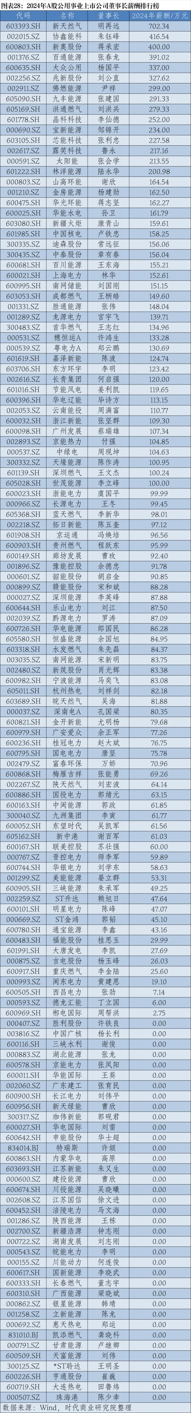 Wind数据显示,2024年,A股公用事业董事长的薪酬平均值为127.08万元。其中,薪酬最高的是新天然气(603393.SH)明再远,为702.34万元;薪酬最低的是郴电国际(600969.SH)周帮洪,为2.75万元。
