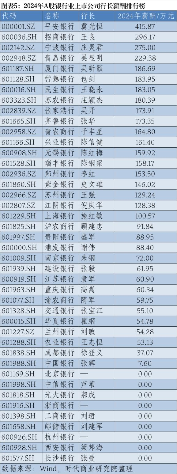 2024年,A股银行业行长的薪酬平均值为134.72万元。其中,薪酬最高的是平安银行(000001.SZ)冀光恒,为415.87万元;薪酬最低的为中国银行(601988.SH)张辉,为7.60万元。