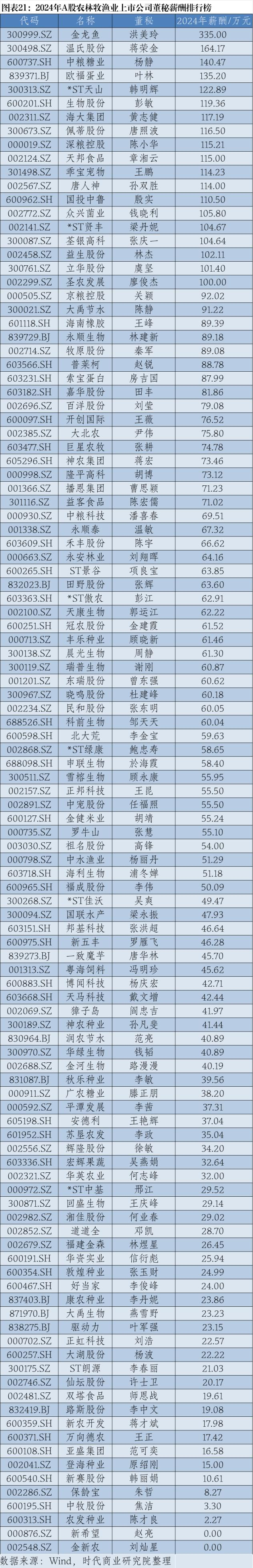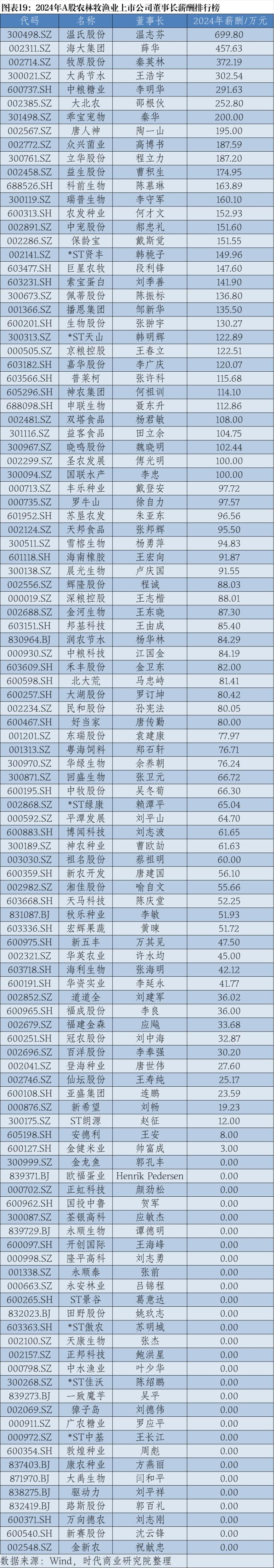 Wind数据显示,2024年,A股农林牧渔业董事长的薪酬平均值为111.73万元。其中,薪酬最高的是温氏股份(300498.SZ)温志芬,为699.80万元;薪酬最低的是金健米业(600127.SH)帅富成,为3.00万元。
