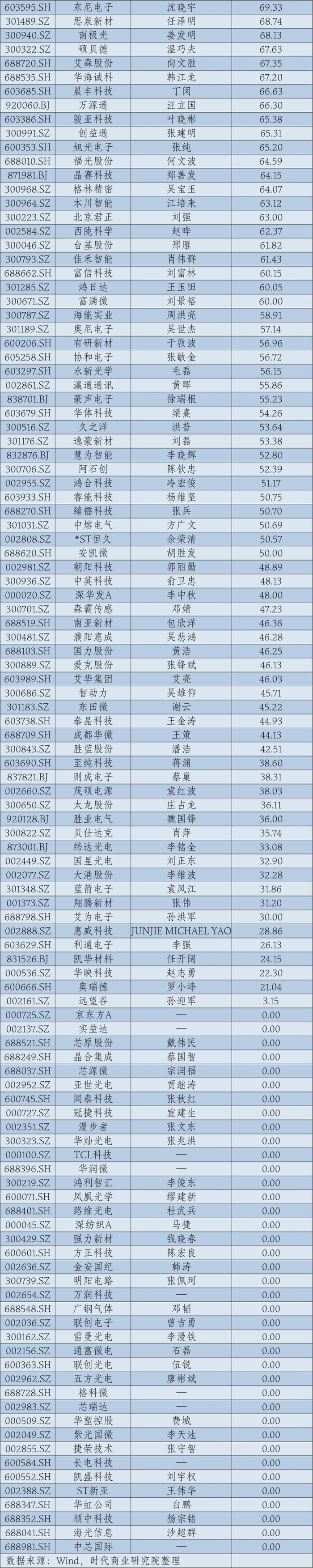 Wind数据显示,2024年,A股电子业董事长的薪酬平均值为174.93万元。其中,薪酬最高的是中微公司(688012.SH)尹志尧,为1485.14万元;薪酬最低的是华特气体(688268.SH)石平湘,为3.96万元。