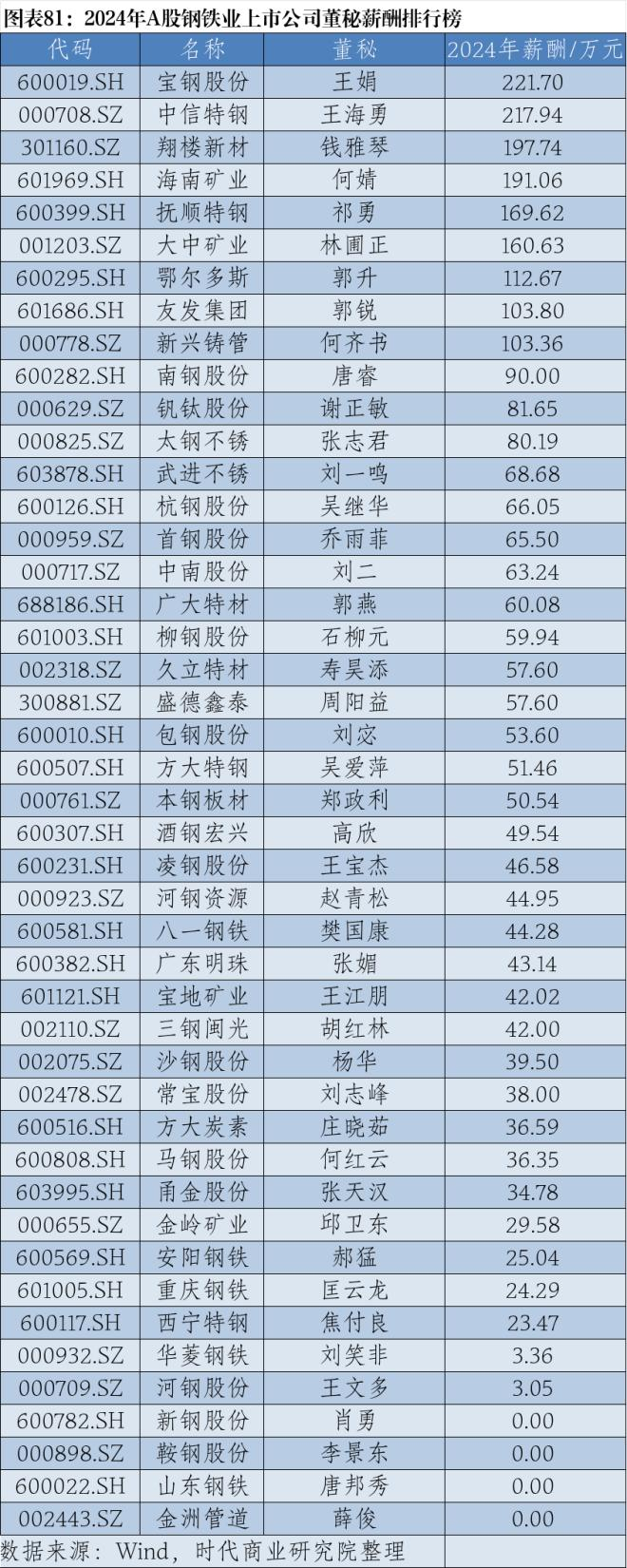 2024年,A股钢铁业董秘的薪酬平均值为72.96万元。其中,薪酬最高的是宝钢股份(600019.SH)王娟,为221.70万元;薪酬最低的是河钢股份(000709.SZ)王文多,为3.05万元。