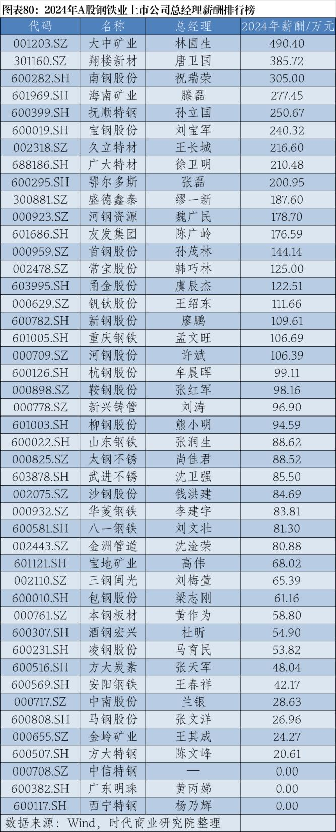 2024年,A股钢铁业总经理的薪酬平均值为130.51万元。其中,薪酬最高的是大中矿业(001203.SZ)林圃生,为490.40万元;薪酬最低的是方大特钢陈文峰,为20.61万元。