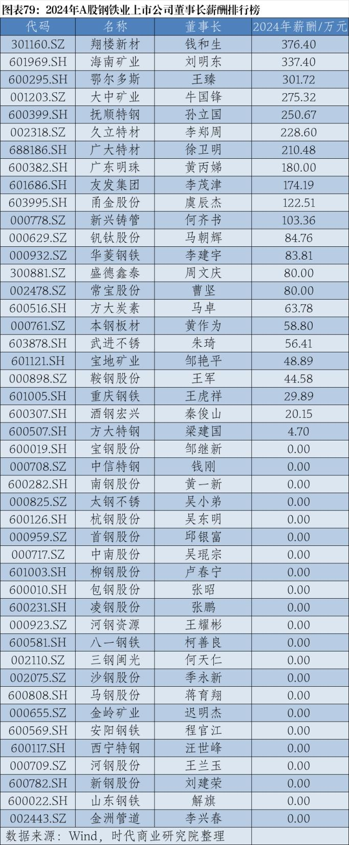 Wind数据显示,2024年,A股钢铁业董事长的薪酬平均值为139.84万元。其中,薪酬最高的是翔楼新材(301160.SZ)钱和生,为376.4万元;薪酬最低的是方大特钢(600507.SH)梁建国,为4.70万元。