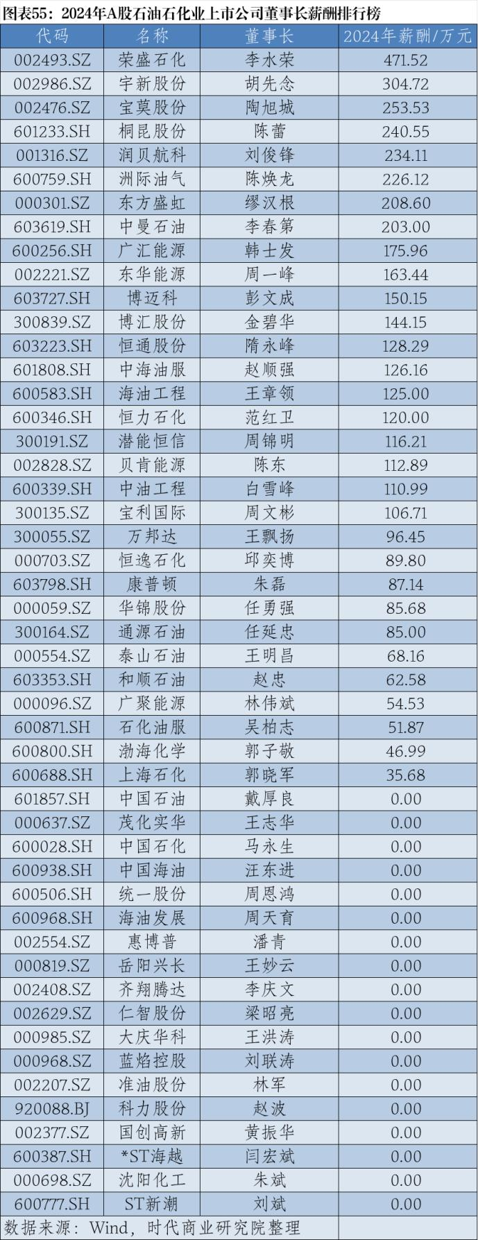 Wind数据显示,2024年,A股石油石化业董事长的薪酬平均值为144.71万元。其中,薪酬最高的是荣盛石化(002493.SZ)李水荣,为471.52万元;薪酬最低的是上海石化(600688.SH)郭晓军,为35.68万元。