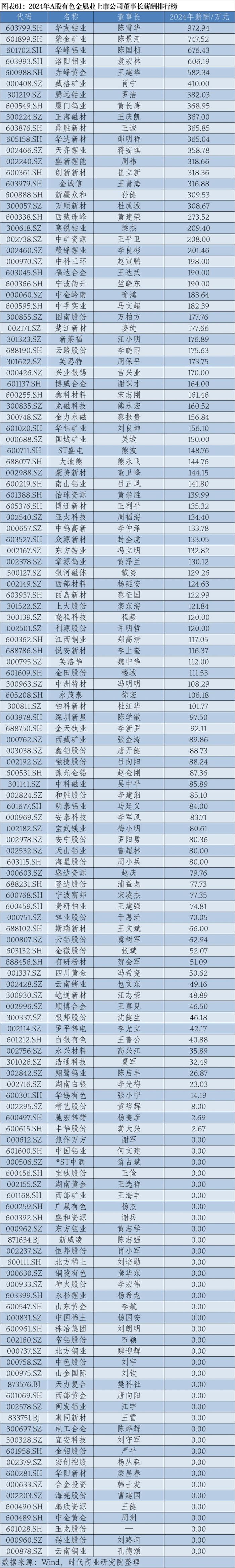Wind数据显示,2024年,A股有色金属业董事长的薪酬平均值为169.29万元。其中,薪酬最高的是华友钴业(603799.SH)陈雪华,为972.94万元;薪酬最低的是丰华股份(600615.SH)龚大兴,为2.67万元。