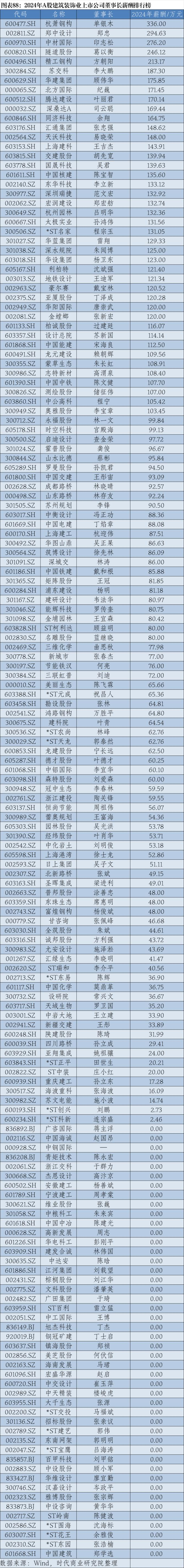 Wind数据显示,2024年,A股建筑装饰业董事长的薪酬平均值为91.97万元。其中,薪酬最高的是杭萧钢构(600477.SH)单银木,为336.00万元;薪酬最低的是*ST科新(600234.SH)连宗盛,为2.46万元。