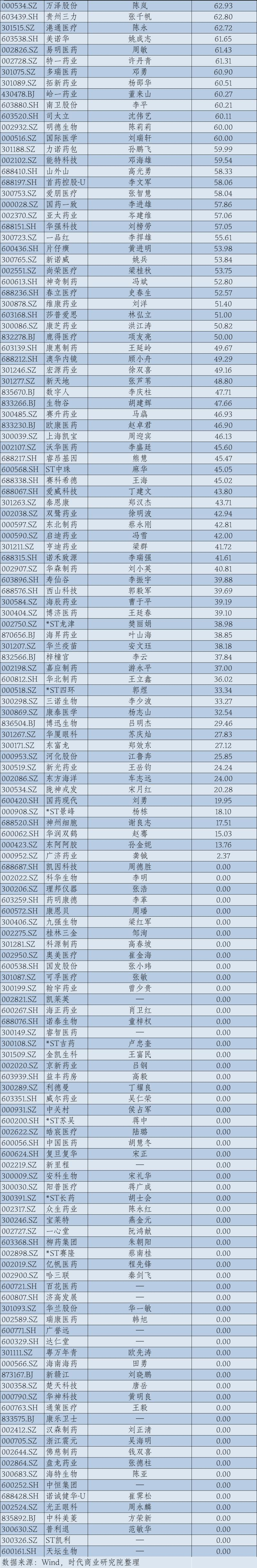Wind数据显示,2024年,A股医药生物业董事长的薪酬平均值为173.97万元。其中,薪酬最高的是药明康德李革,为4180.00万元;薪酬最低的是东宝生物(300239.SZ)王爱国,为0.96万元。