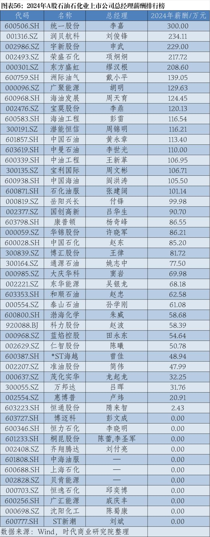 2024年,A股石油石化业总经理的薪酬平均值为101.46万元。其中,薪酬最高的是统一股份(600506.SH)李嘉,为300.00万元;薪酬最低的是恒通股份(603223.SH)隋来智,为2.43万元。