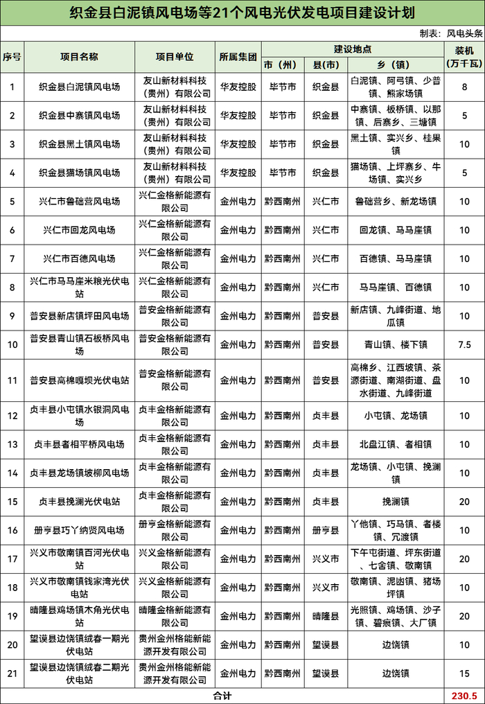 通知指出,按照省政府工作部署,贵州省能源局结合实际研究制定了织金县白泥镇风电场等21个风电光伏发电项目建设计划,总装机230.5万千瓦,现予以下达。