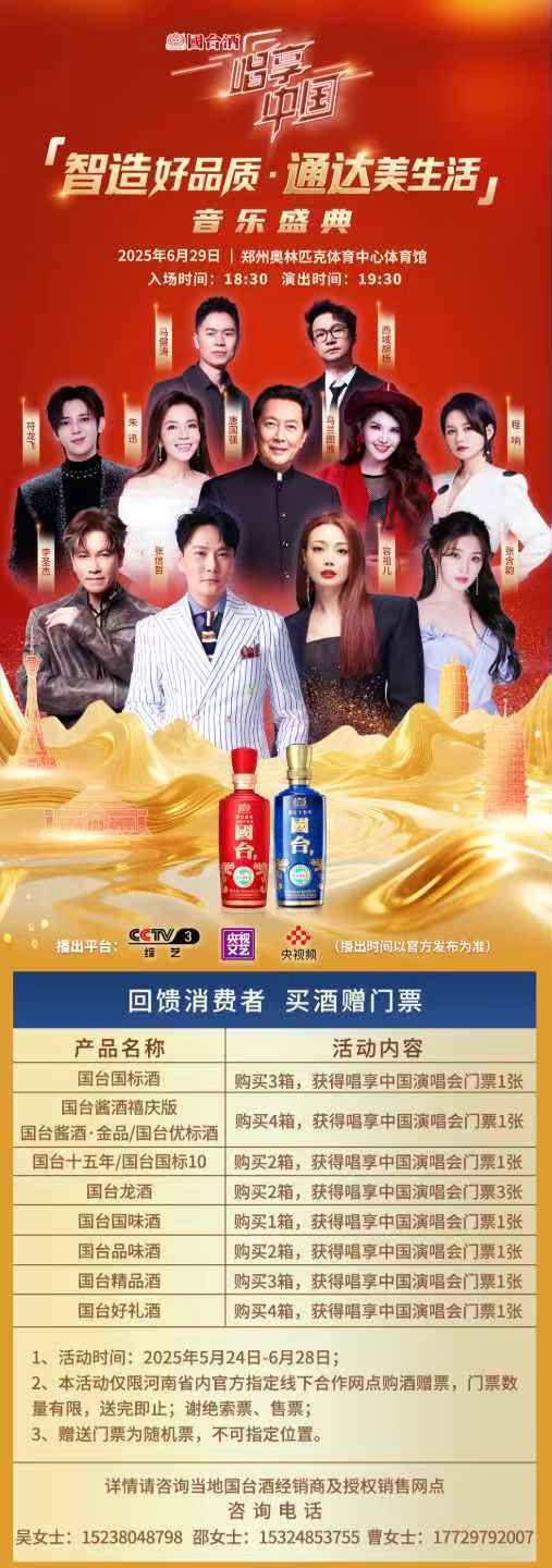 此外还将有西域胡杨将献唱《请喝一杯国台酒》《大国酱香五千年》,马健涛带来《酒通天下》,唐国强朗诵《国台赋》选段,这些环节将酿造工艺与地域文化熔铸成艺术诗篇。更实在的回馈是"买酒赠门票"活动,让消费者在美酒与音乐中感受"被重视"的温度。