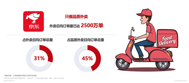 艾瑞咨询数据显示,618期间,京东外卖日均订单量已突破2500万单,占据全国外卖市场超31%的份额,在品质外卖细分领域约有45%的市场占有率。