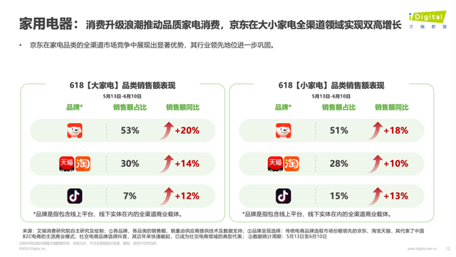 艾瑞咨询数据显示,5月13日-6月10日,京东全渠道带电品类销售额占比及增速位列第一,其中,3C数码销售占比50%,同比增幅高达45%;大家电销售额占比53%,同比增幅达20%,小家电销售额占比51%,同比增长18%,主场基本盘稳稳领先。