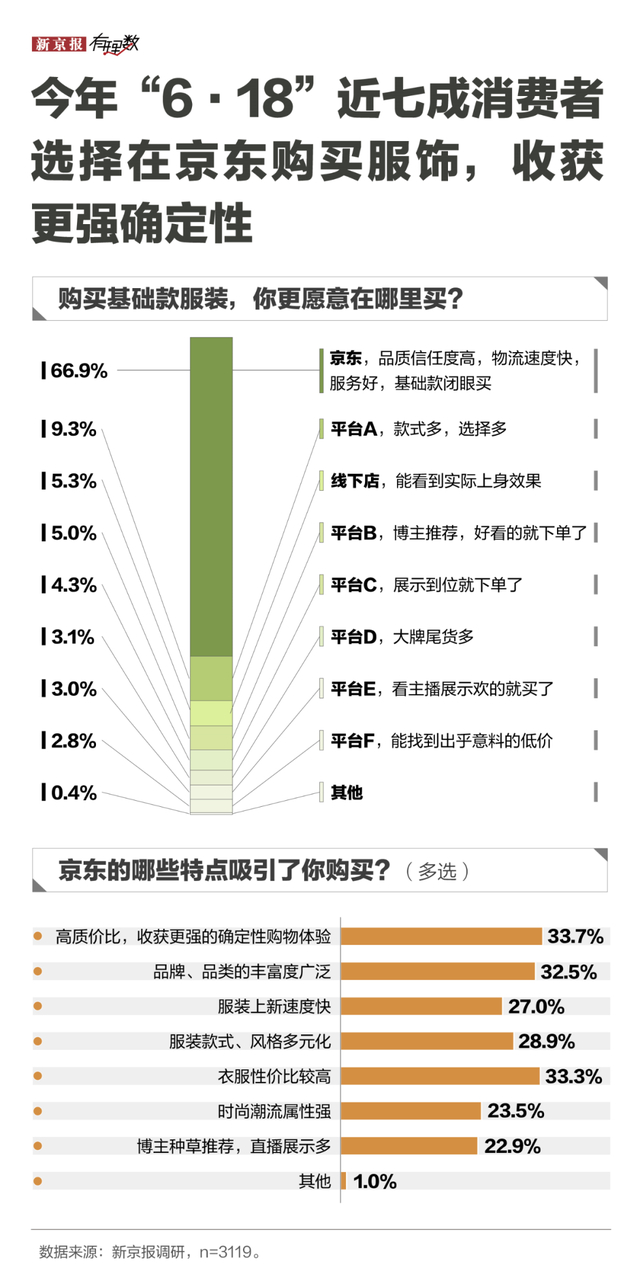 通过“高品质服饰”的心智打造,京东吸引到更多关注品质的消费者。新京报调查显示,超七成(74.0%)的消费者认为京东服装品质更有保障。