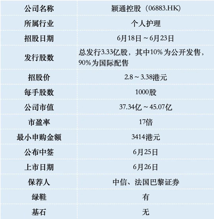 对比港股同行美妆公司,上美股份市值268亿港元,估值31倍;毛戈平市值市值489亿港元,估值51倍。不过人家都是自有品牌,体量也比颖通大的多。颖通2025财年利润2.27亿港元,按发行价中位数算市值41亿,估值17倍,营收和净利润每年还能保持双位数增长,这个估值不算贵。