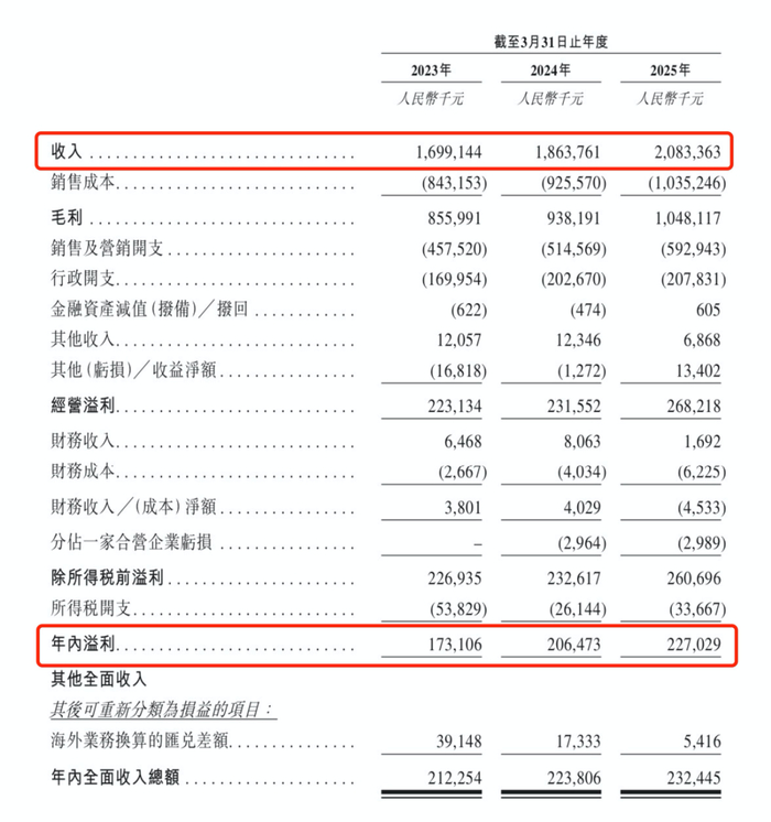 财务数据显示,在过去的2023财年~2025财年(财政年结日为3月31日),颖通控股的营业收入分别人民币16.99亿、18.64亿和20.83亿元,三年复合增长率10.7%;相应的净利润分别为人民币1.73亿、2.06亿和2.27亿元,复合增长14.5%,毛利率维持在50%左右。