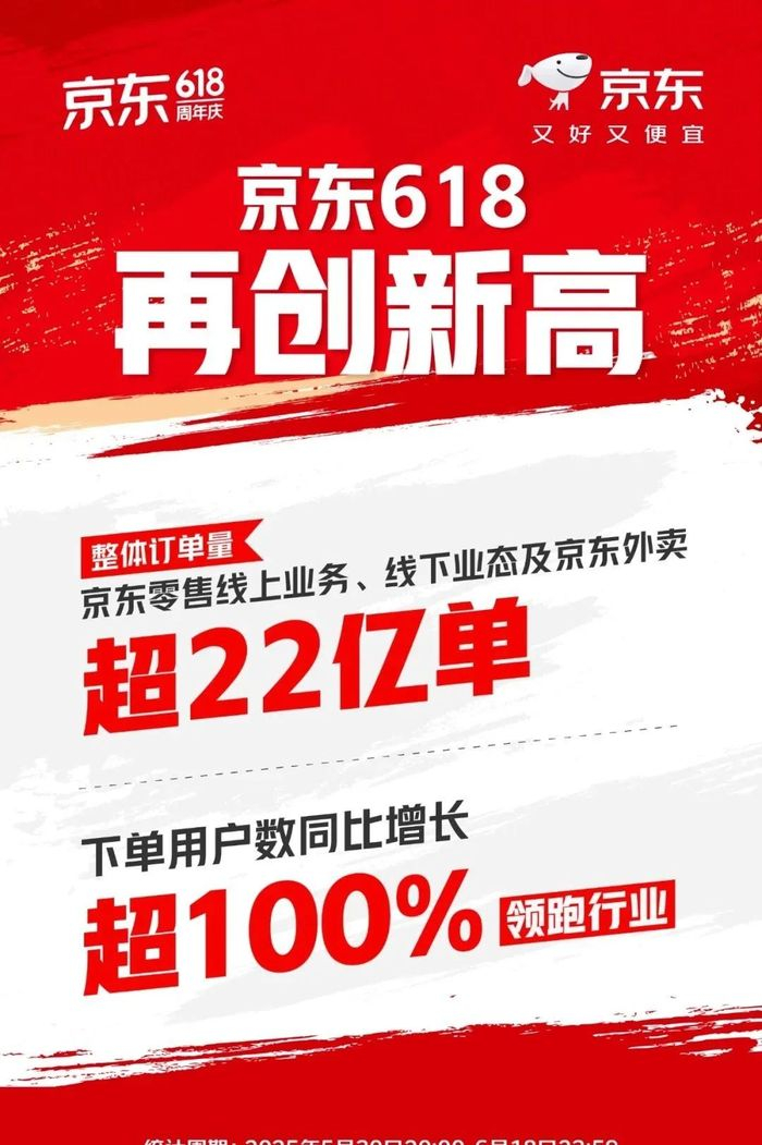 京东对外公布的数据同样也是增长的。618 前一天公司创始人刘强东阔别多年后再度面对媒体,对外展示完全回归的信号。当天刘强东谈了很多,但唯一没提及的就是 618。第二天京东在总部举行了盛大的 618 收官发布会,对外宣布下单用户数翻倍增长、京东零售线上线下及京东外卖总体订单量超 22 亿单。