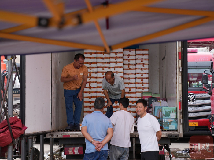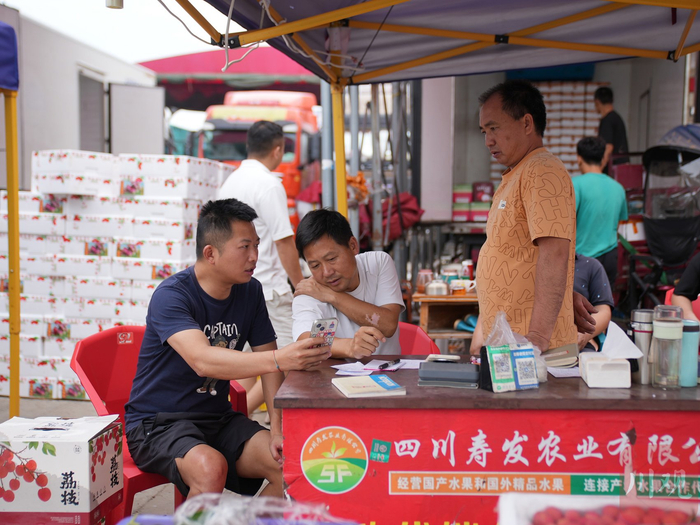6月20日,四川雨润国际农产品交易中心,荔枝批发商陈寿发(中)和客户磋商荔枝价格。