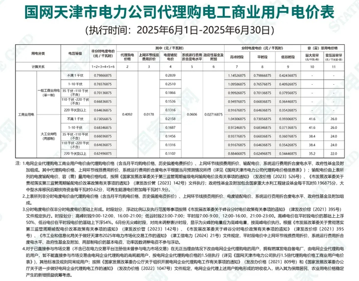 2025年6月,天津市的销售侧,不同电压等级的峰、平、谷电价为0.3445~1.1453元/kWh。