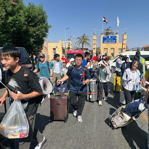 6月19日,从以色列撤离的中国公民从埃及南西奈省塔巴口岸进入埃及。新华社发(艾哈迈德·戈马 摄)