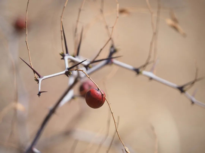 酸枣的枝干上长满了又长又硬的刺,采摘酸枣可不是一件容易的事,一不小心就会扎破皮肤。成语“荆棘密布”中的“棘”就是指酸枣,至今西北一些地方还管酸枣叫“棘子”。
