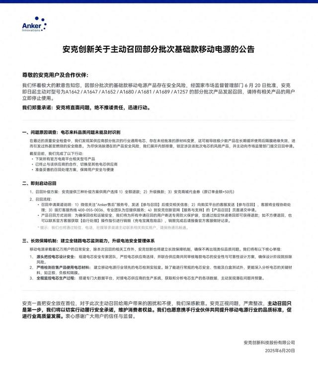6月20日,@安克创新 发布关于主动召回部分批次基础款移动电源的公告。