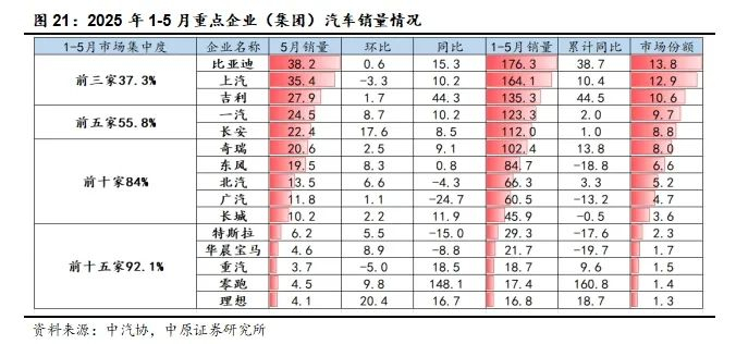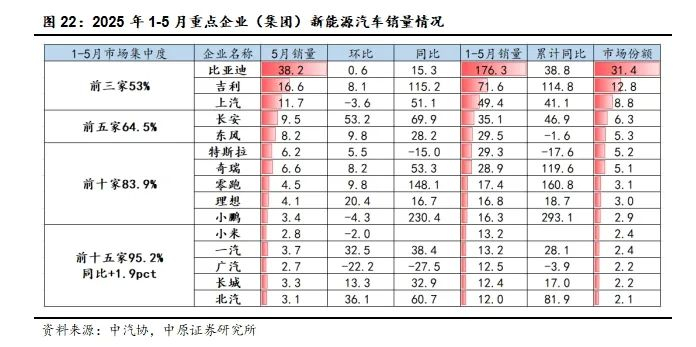 新能源汽车行业呈现更高的集中度,且集中度有进一步上升趋势。2025年1-5月新能源汽车销量前15名集团的合计销量533.7万辆,占新能源汽车销售总量的95.2%,同比提升了1.9个百分点。销量第一的比亚迪市场份额遥遥领先,达到31.4%,超越第二名吉利18.6个百分点,处于强势头部地位。