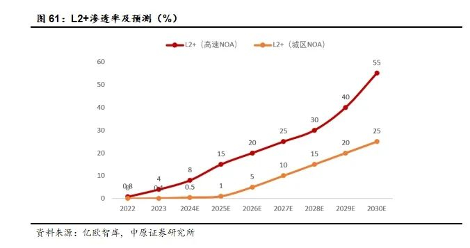 乘用车城市领航辅助驾驶(NOA)快速发展,L2+智驾功能渗透率不断提升,未来市场空间广阔。2022年,高速NOA开始逐步推广落地,2023-2024年,高速NOA已进入全面推广应用阶段,城市NOA开始推广普及,多家车企实现城市NOA,车企竞相布局推动了城市NOA的不断落地。根据亿欧智库,2023年中国L2+智驾功能渗透率进一步提升,其中高速NOA渗透率为4%,城区NOA渗透率为0.1%;2024年L2+智驾功能预计将达到8.5%,其中高速NOA渗透率预计达8%,城区NOA渗透率预计达0.5%;2024年后,城区NOA功能将迎来飞速发展,预计2030年高速NOA渗透率将达到55%、城区NOA渗透率将达到25%。