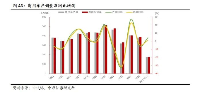 商用车市场呈现回暖趋势,2025年前5个月累计产销量保持微增。商用车产销从2014年至2020年整体呈上升态势,2021年以来,受疫情等因素影响全球经济增长乏力,特别是新兴市场国家经济增速放缓,导致对重卡等重资产需求减少,2022年商用车产销量降至低点,分别完成318.4万辆、329.92万辆,同比分别-31.68%、-30.98%,2023年,受宏观经济稳中向好、物流行业回暖、旅游市场复苏以及各项利好政策拉动等因素影响,中国商用车市场实现了恢复性增长,2024年由于投资减弱加之运价偏低,商用车终端市场换车需求动力不足,导致市场表现相对疲弱,产销分别完成380.53万辆、387.39万辆,同比分别-5.80%、-3.95%;2025年1-5月商用车产销累计分别完成174.57万辆和175.27万辆,同比分别+4.21%、+1.23%。