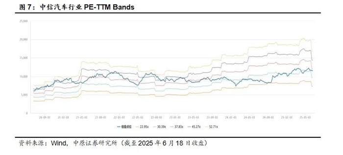 从近5年中信汽车行业的PE-TTM Bands来看,行业目前估值水平处于历史中等偏低水平。