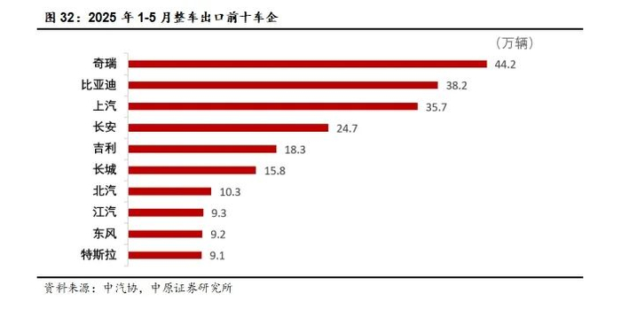 车企整车出口来看,奇瑞稳居出口量首位,比亚迪快速追赶。2025年1-5月,奇瑞出口量达到44.2万辆,同比增长1.6%,占总出口量的17.7%,居整车出口量首位;其次是比亚迪,与上年同期相比,比亚迪出口增速最为显著,出口达38.2万辆,同比增长1.1倍,与奇瑞汽车出口量差距逐渐缩小。