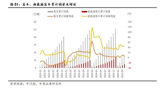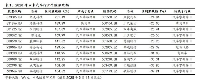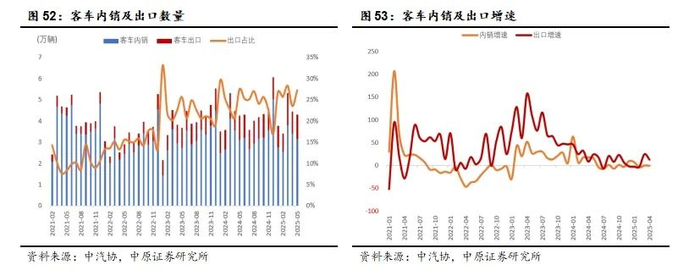 行业回顾:汽车产销量快速增长,政策面激发消费潜力。2025年以来中国汽车市场延续增长态势,以旧换新等政策持续推进,效果显著,新能源汽车表现突出,渗透率持续提升,2025年5月达48.65%;汽车行业格局呈现集中化的特征。库存整体上升,结构呈现分化。2025年前5个月库存总量持续增长,受政策等因素刺激,车企普遍加大生产备货;结构呈现分化,自主品牌和新势力品牌的乘用车库存持续上升,合资和其他类型乘用车库存持续下降。出口支撑行业增长,插混成为出口重要增长点。出口持续增长成为行业销量的重要支撑;受益于新能源汽车的快速崛起,乘用车出口表现好于商用车;2025年来新能源汽车出口增速亮眼,传统燃油车出口下降;新能源汽车细分看,插混车型是出口重要增长点。乘用车新能源渗透率提高,自主品牌市场份额攀升。2025年前5个月新能源乘用车销量同比+41%;自主品牌乘用车市场份额提升至69%,合资/外资品牌占有率持续下滑;车型两端分化特征明显,微型及小型轿车、中高端 SUV成为增长核心;乘用车市场成交均价整体下探;行业格局方面,头部品牌加速领跑,厂商表现分化。商用车受政策带动呈现回暖,新能源及出口表现较好。2025年前5个月商用车产销量保持微增;商用车出口表现活跃,占比持续提升;新能源商用车销量及渗透率持续提升至近18%,未来上升空间较大;以旧换新政策带动货车行业及新能源客车市场销量增长,重卡购车需求上升,新能源重卡持续跑赢行业;出口为客车行业持续提供动能。