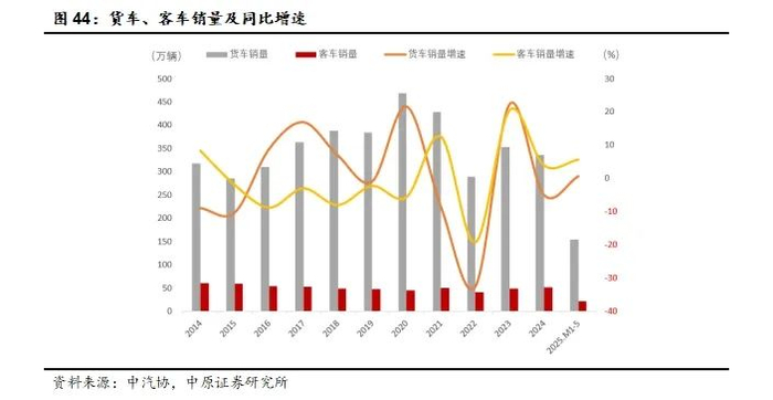 货车周期性更为明显,客车相对稳定。分车型来看,货车产销量远大于客车,但受宏观经济影响呈现更为明显的周期性,而客车依托消费和公共服务属性,市场表现相对稳定,2024年受到旅游市场火爆带动,以及以旧换新政策加持,客车市场表现相对较好,全年保持正增长;2025年1-5月,货车、客车销量分别完成154.03万辆和21.24万辆,同比分别+0.65%、+5.70%,货车、客车均呈现回暖,客车表现仍然好于货车。